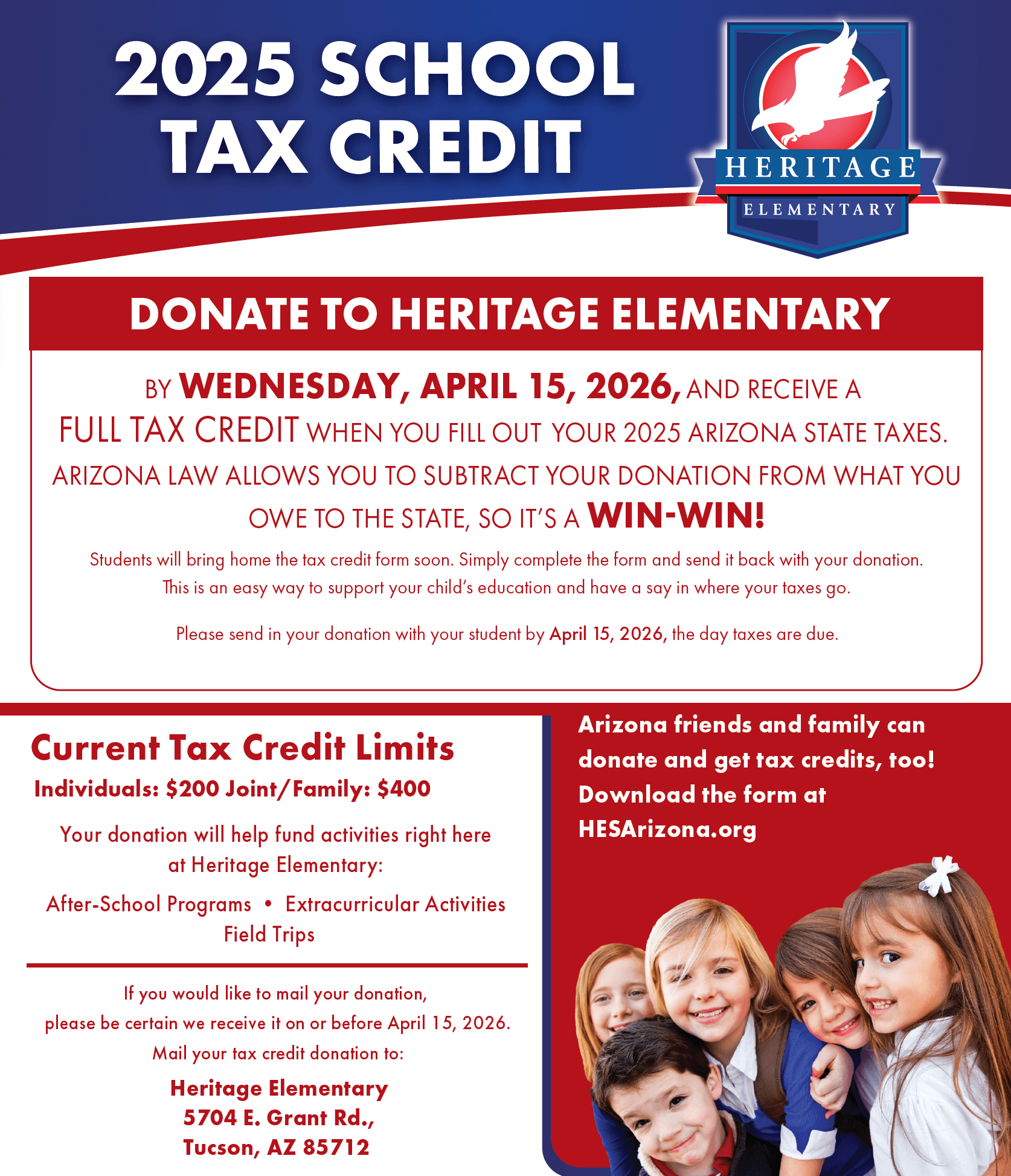 The Arizona State Tax Credit incentive allows taxpayers to donate up to $400 for couples or $200 per individual in tax credit toward Heritage Elementary School.